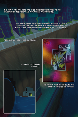 The goal of this project was to create a graphic novel pitch based on a story that was previously developed in DESN2211 Visual Narrative, refining and updating the characters and plot into a more cohesive narrative. A graphic novel format was chosen to express the complex story sections visually and in full colour, highlighting the aesthetic of the world and characters in it.